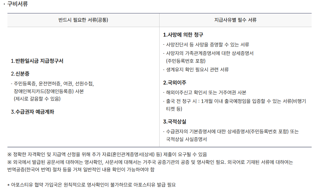 구비서류 제출: 반환일시금 지급청구서, 신분증 사본, 본인 명의 예금계좌 사본 등을 제출합니다.